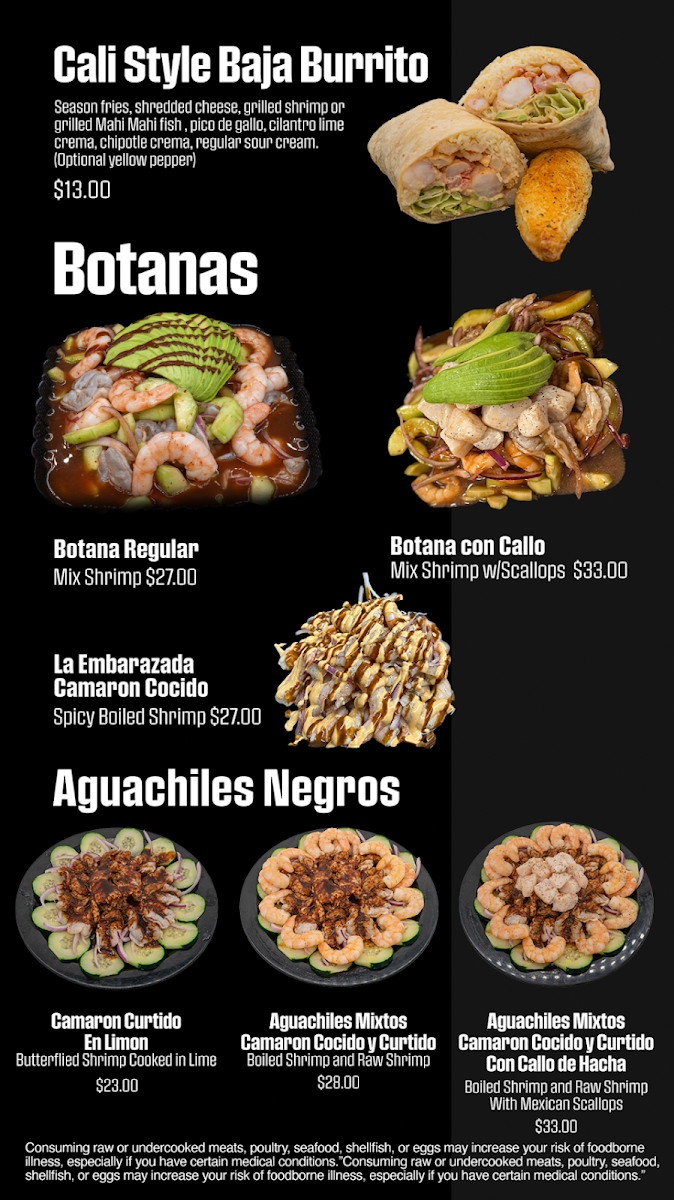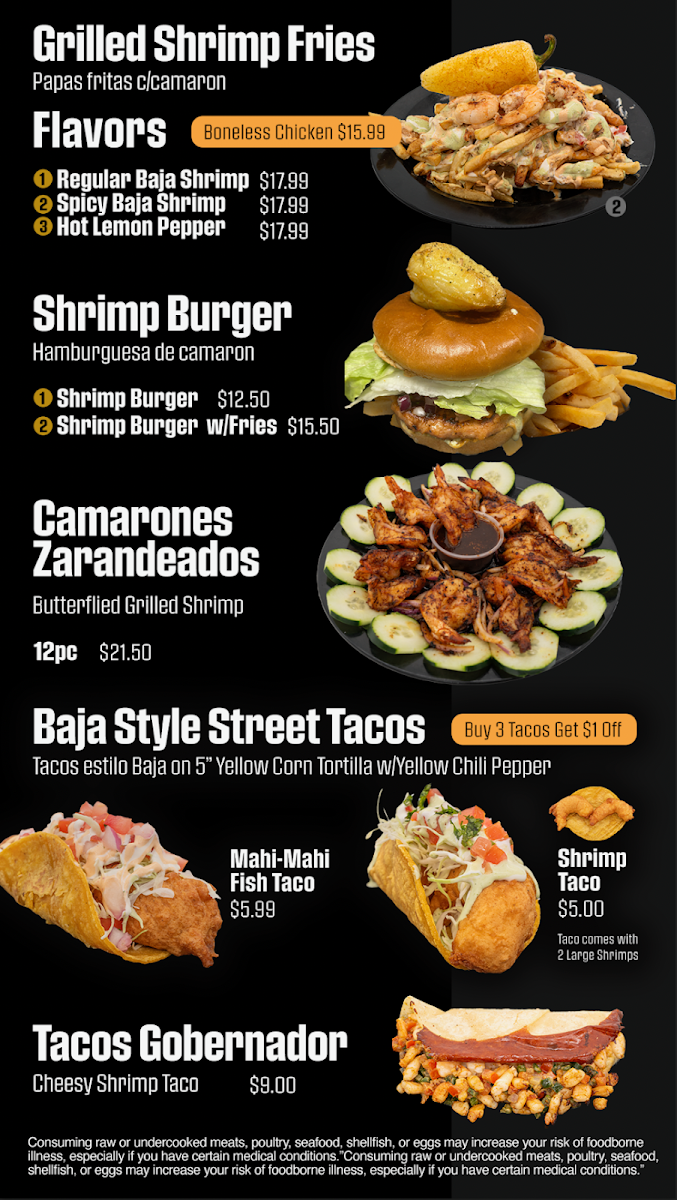 Baja style fish and shrimp tacos, grilled shrimp fries, taco gobernador shrimp cheesy taco. Camarónes Zarandeados